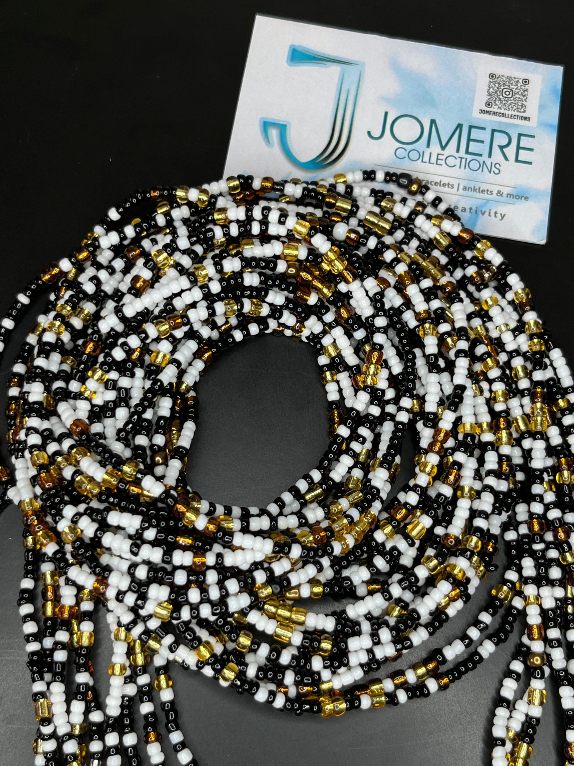 This waist bead set blends black, white, and gold tones for a look that represents clarity, and Hand-strung on soft cotton thread, this piece is waterproof, non-irritating, and designed for everyday wear.