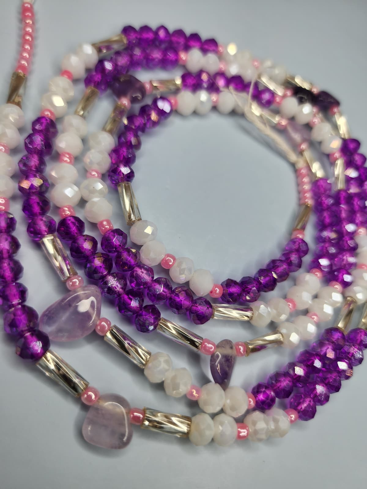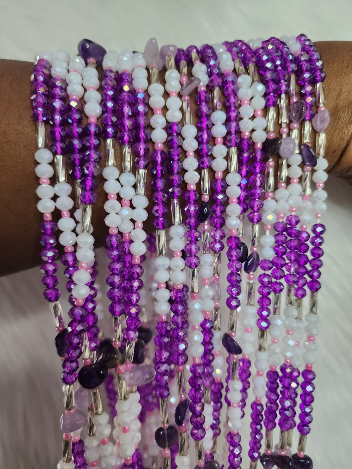 These handmade waist beads feature a vibrant mix of purple, white, and pink beads with silver accents and Amethyst chips, designed for a bold yet feminine look. Adjustable up to 50 inches, this waist bead set is perfect for expressing self-love, confidence, and cultural pride. The sparkling beads add elegance whether worn discreetly or styled visibly as body jewelry.