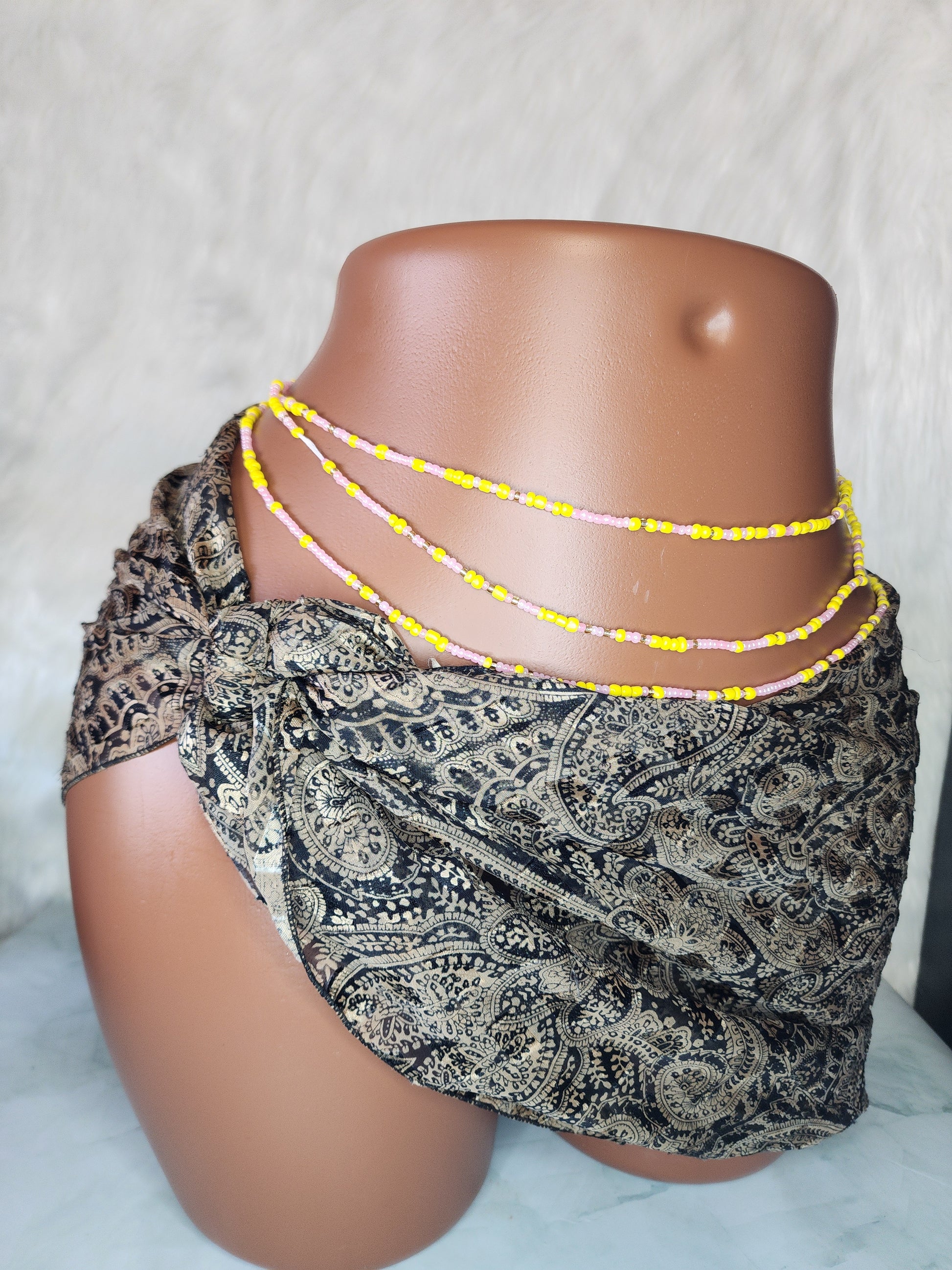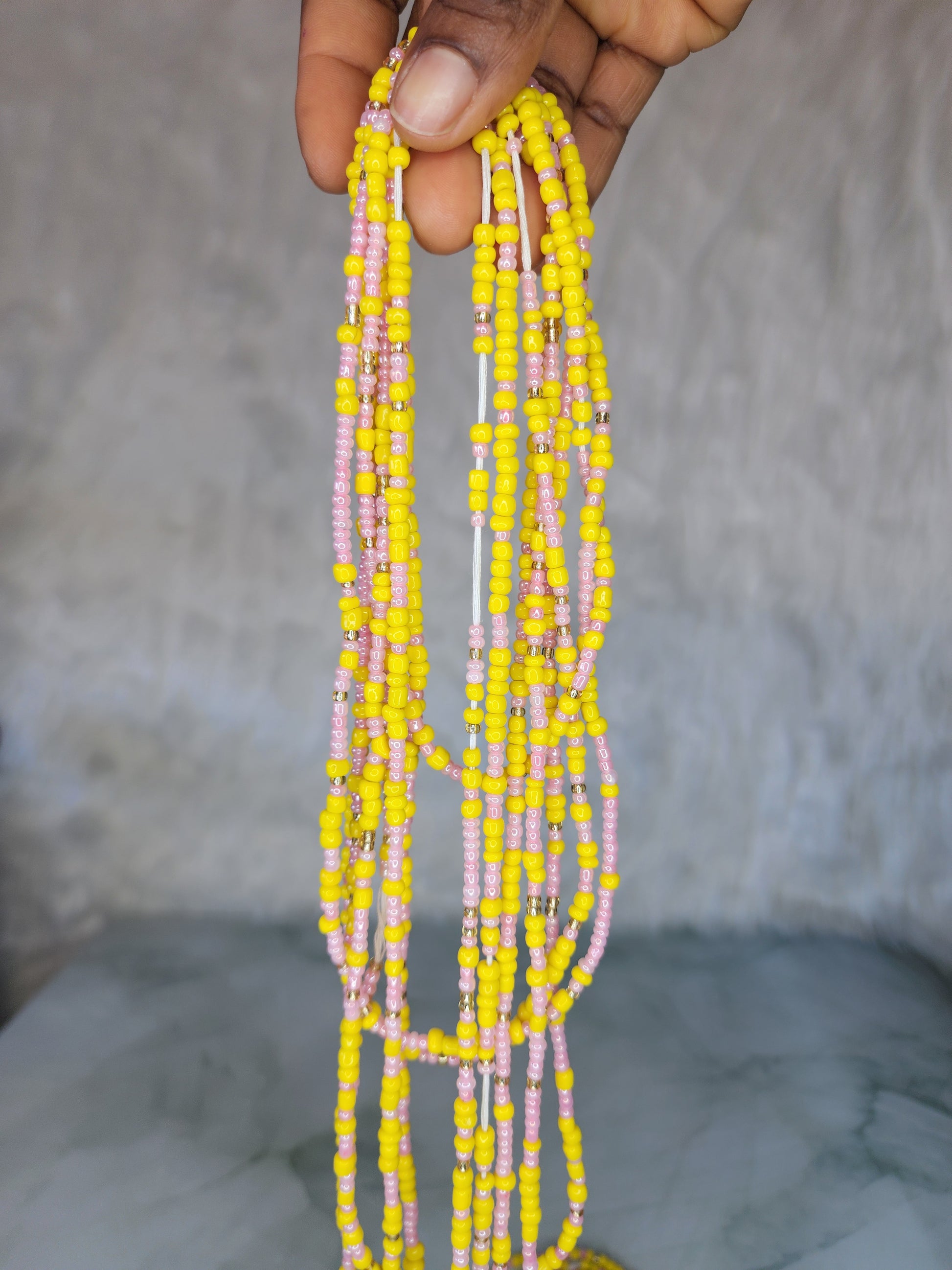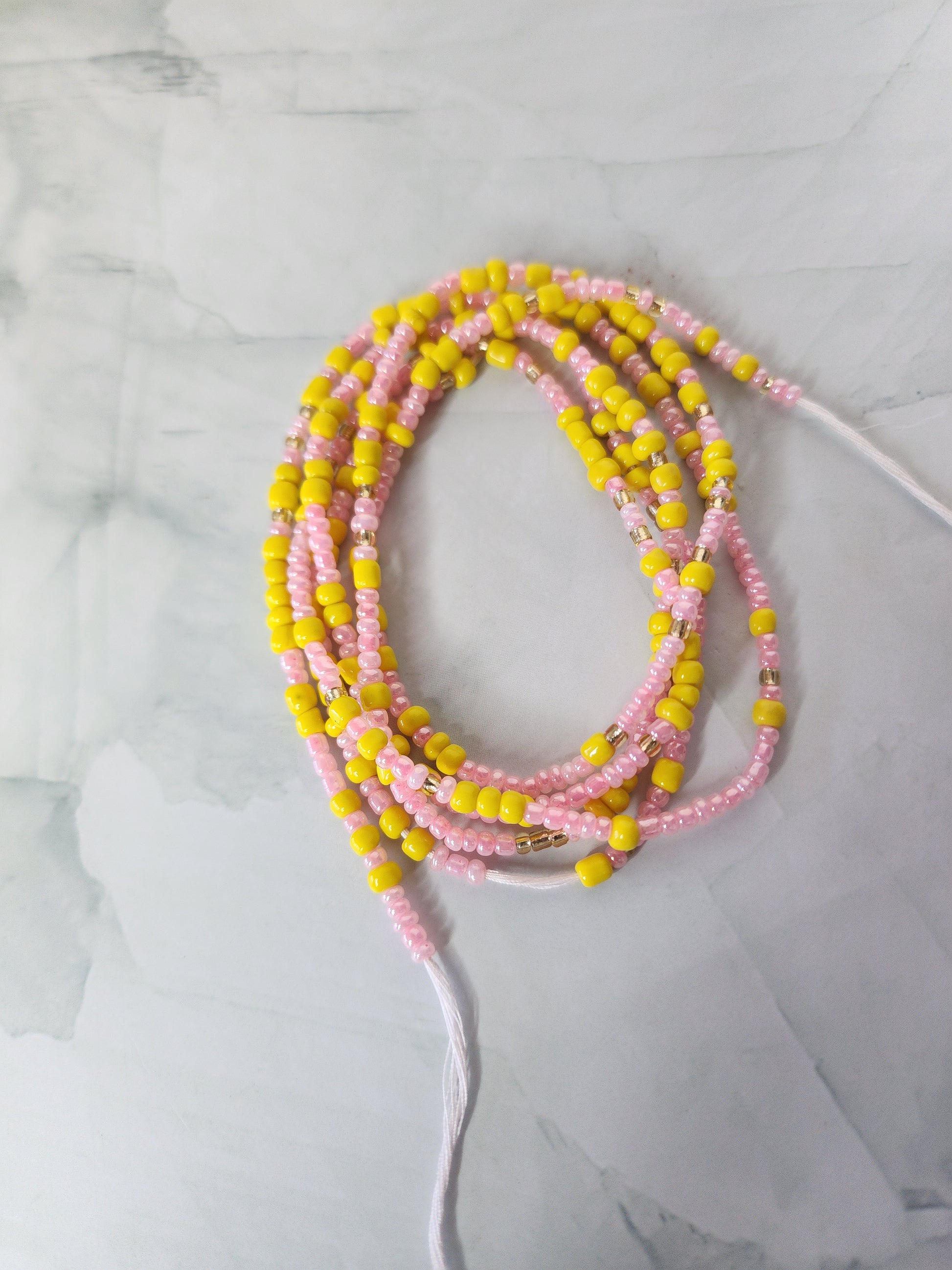 The soft pink tones symbolize kindness and self-love, while the vibrant yellow brings a sense of optimism and positivity. Together, they create a stunning, heartwarming accessory that reminds you to embrace compassion for yourself and others. Perfect for adding a touch of brightness to your day, these waist beads inspire confidence and connection, letting you shine from within.