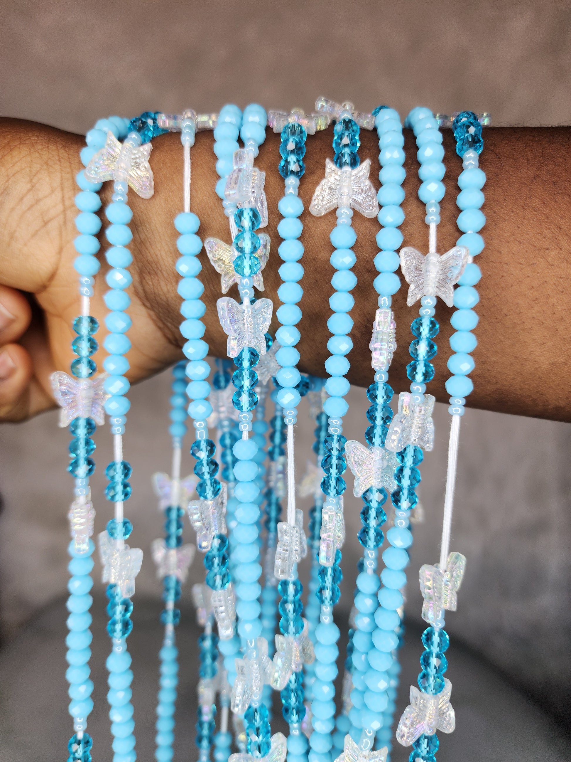 Celebrate your beauty, culture, and confidence with these stunning handmade African waist beads. Featuring rich royal blue crystal beads, shimmering butterfly accents, and unique blue gemstone-style charms, this piece- 'divine promise’ blends elegance with nature. Perfect for body adornment, self-expression, or as a meaningful gift.