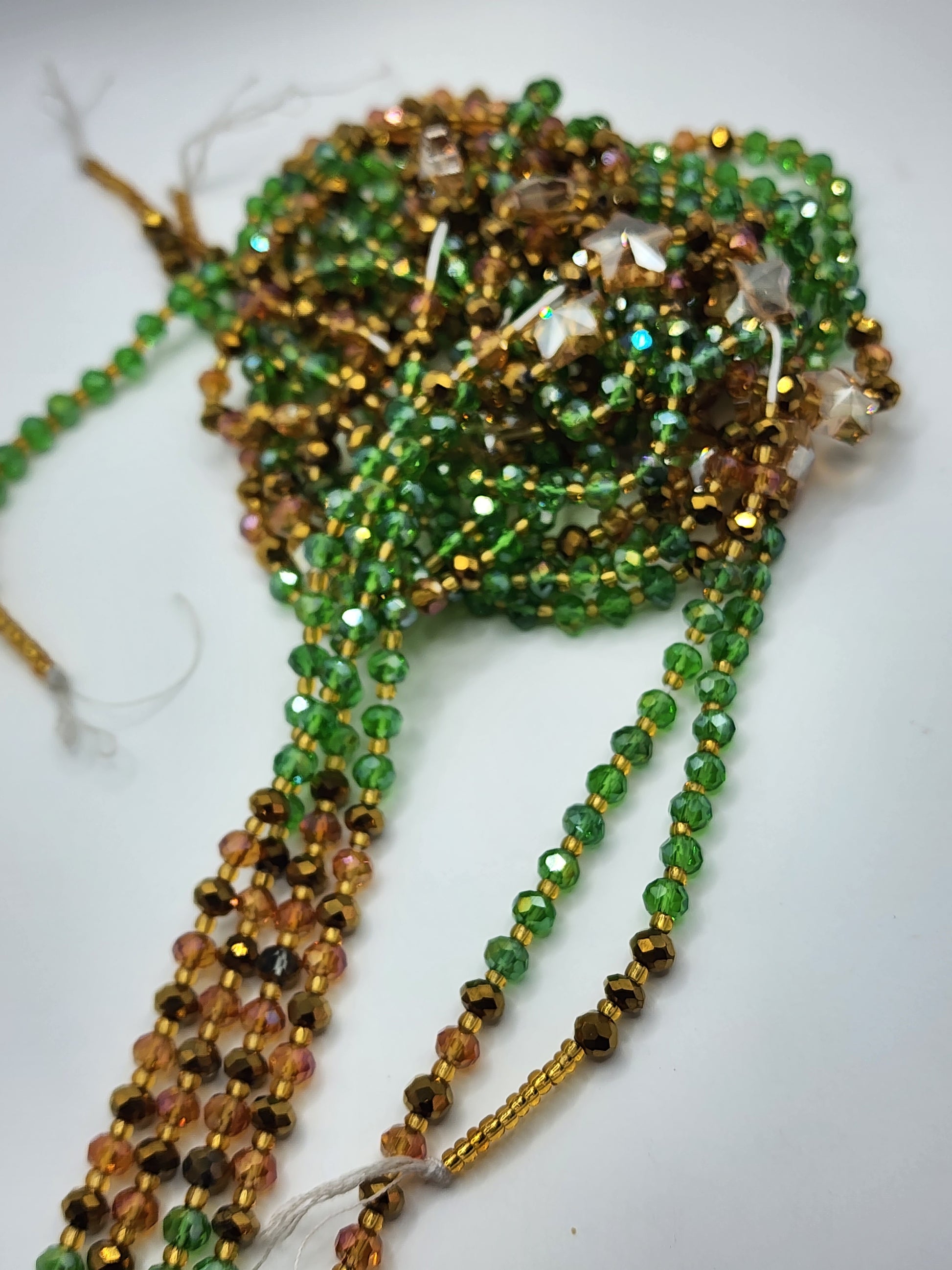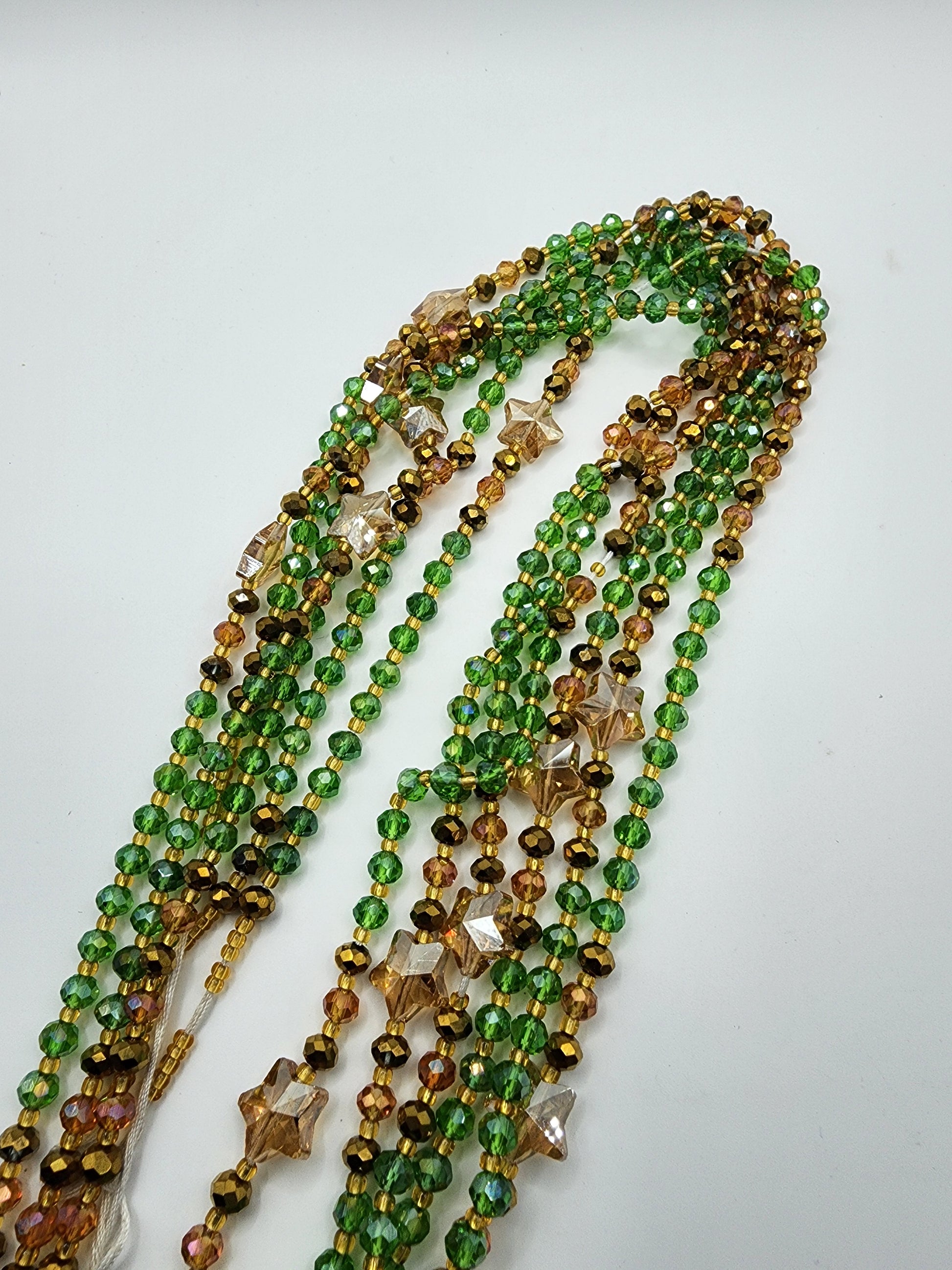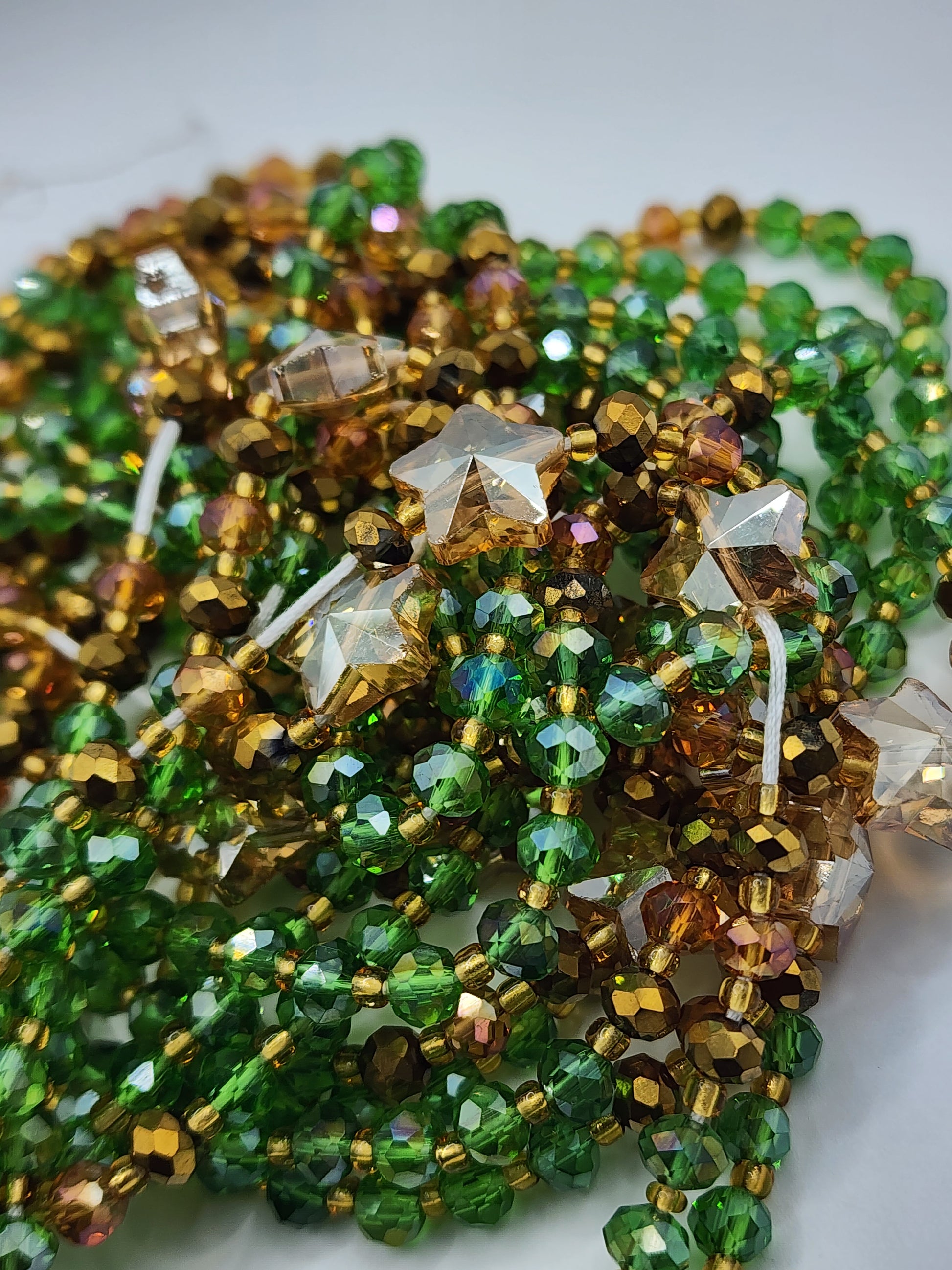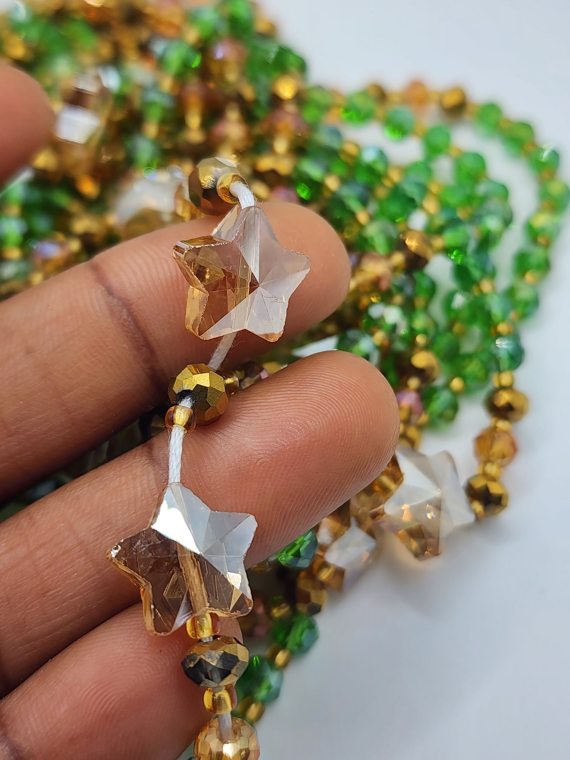 crafted with a beautiful blend of green and gold beads, interspersed with sparkling crystal accents. Each strand is designed to be adjustable, ensuring a perfect fit for all body types.