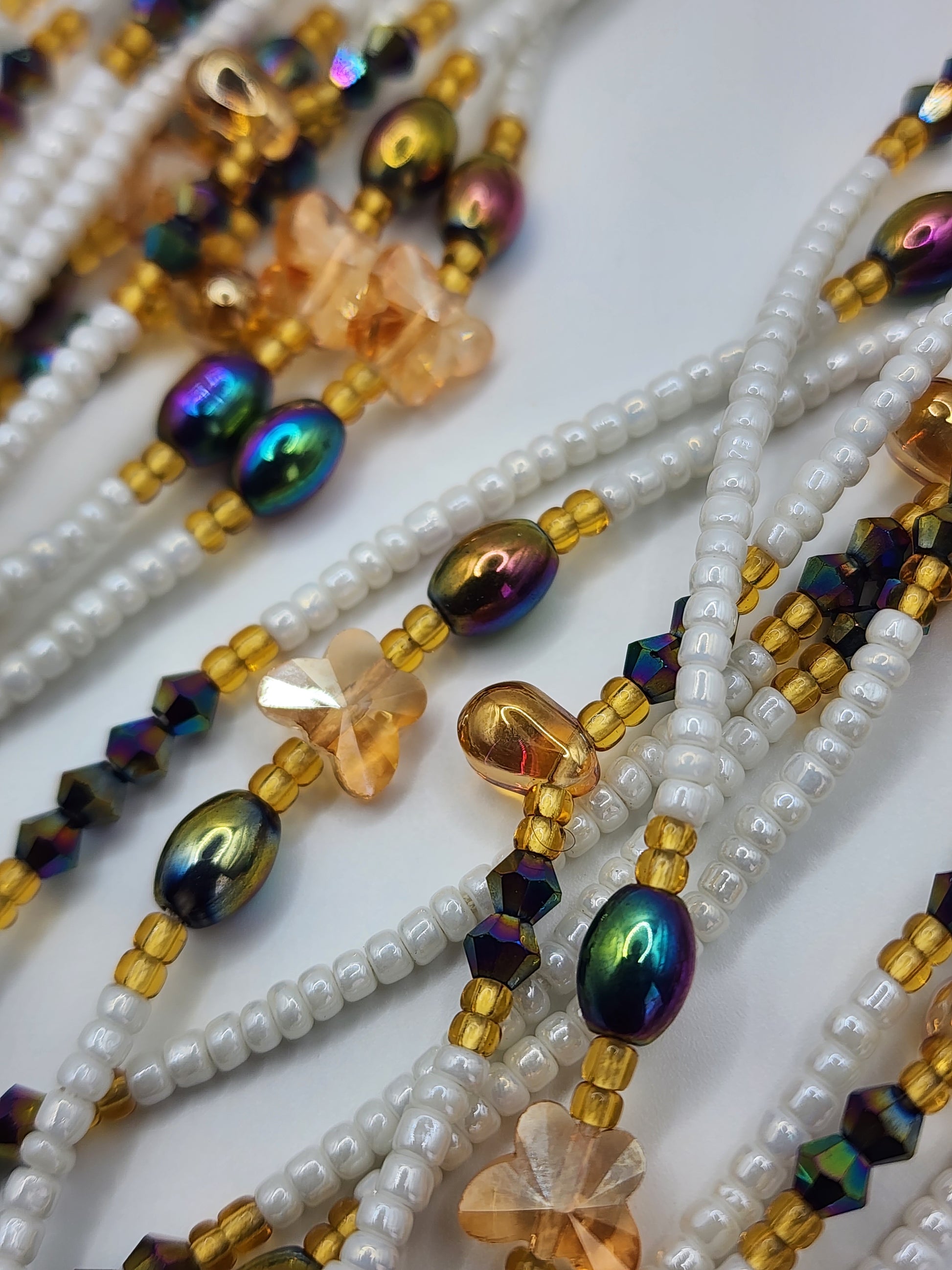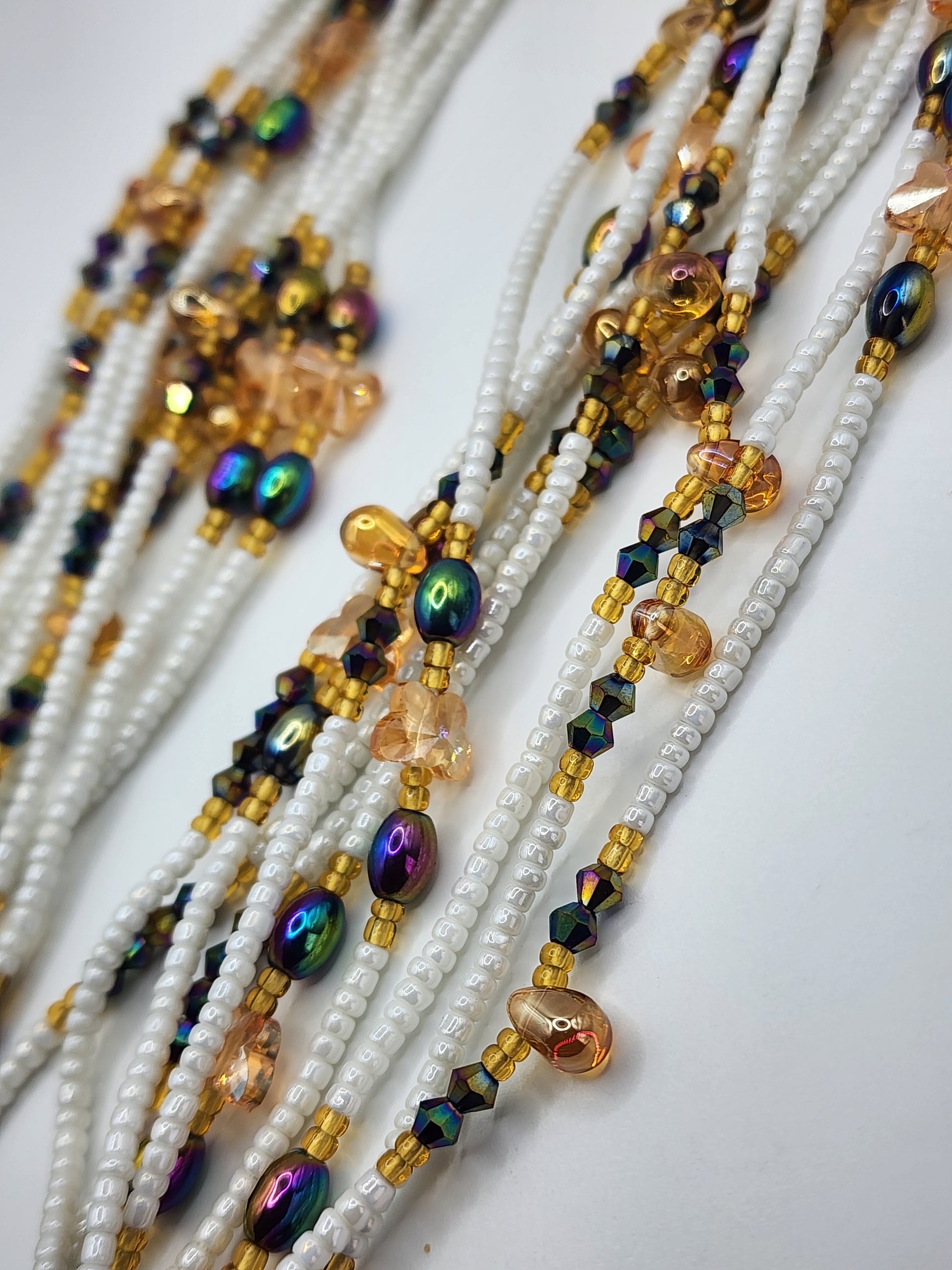Adjustable to 50 INCHES. Handcrafted African waist beads featuring vibrant iridescent and white beads accented with gold. These adjustable waist beads are perfect for self-care, weight loss tracking, and manifestation rituals. The blend of multi-colored beads and gold details adds a touch of elegance and cultural significance, making them a versatile accessory for any outfit. Perfect for celebrating femininity, enhancing body awareness, and promoting positive energy.