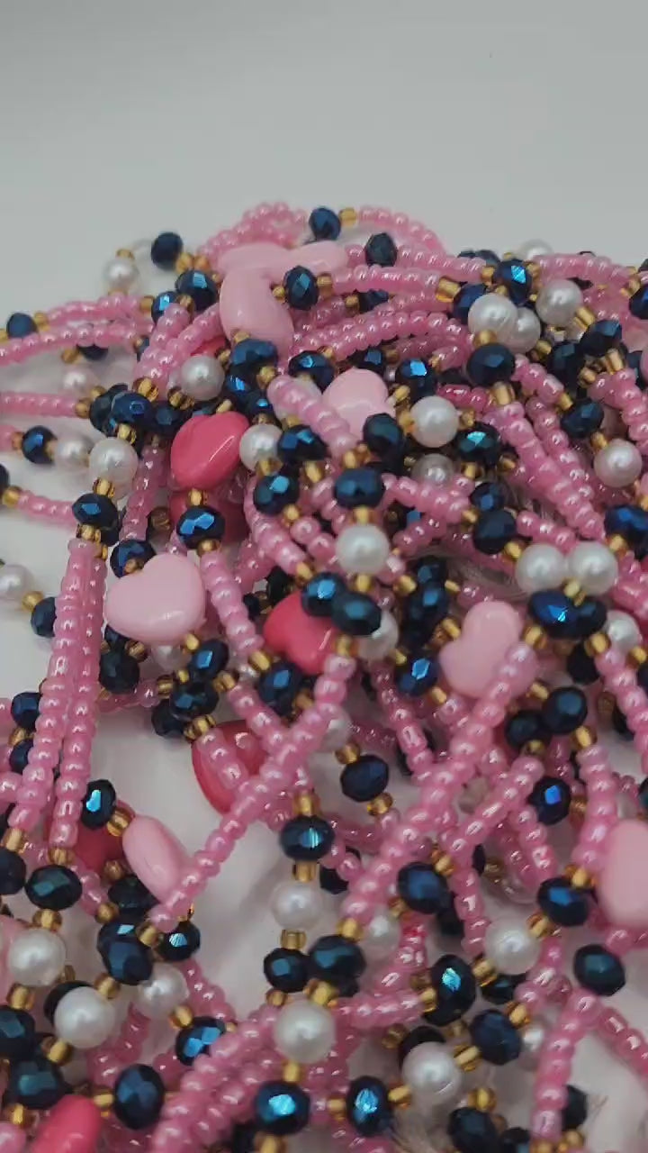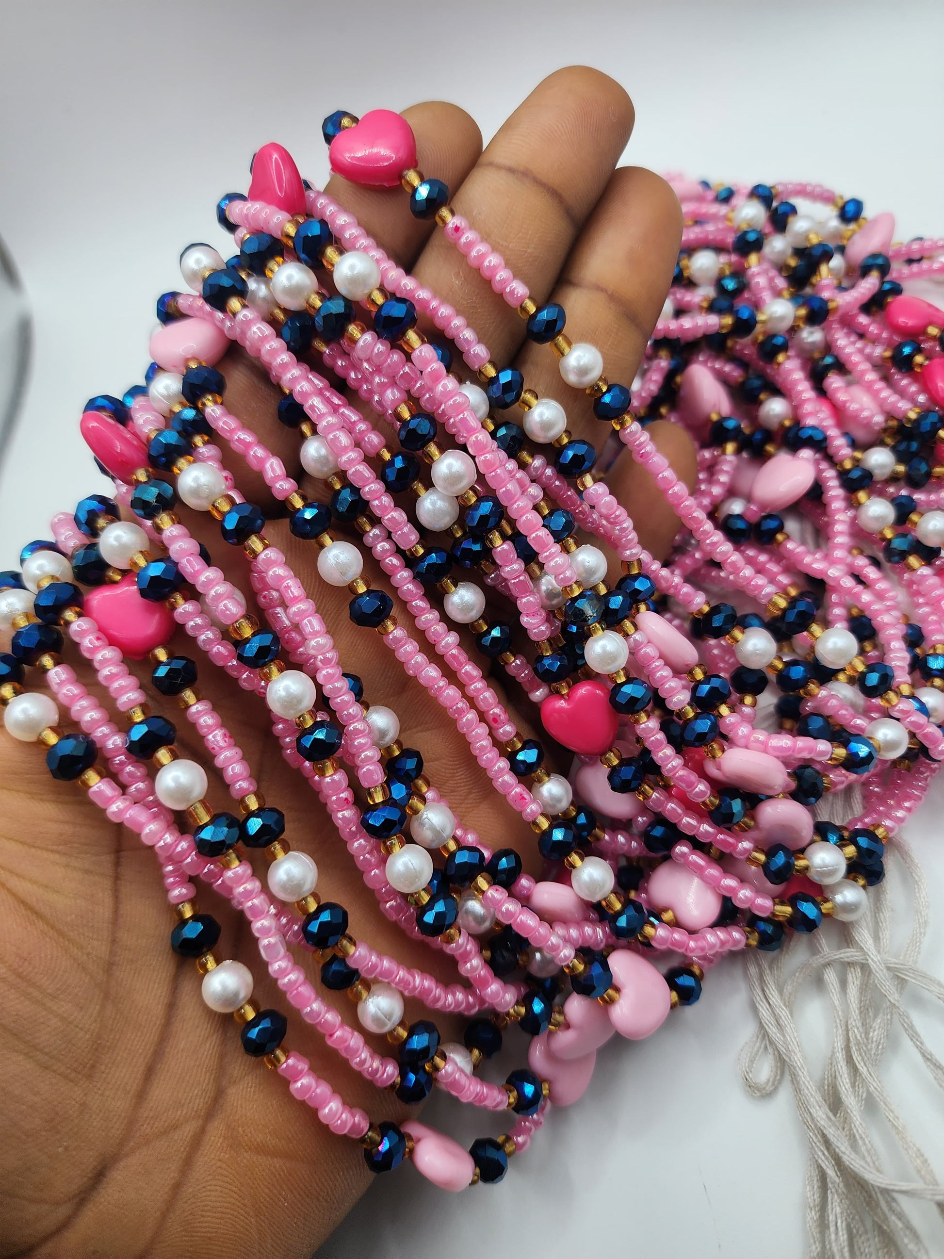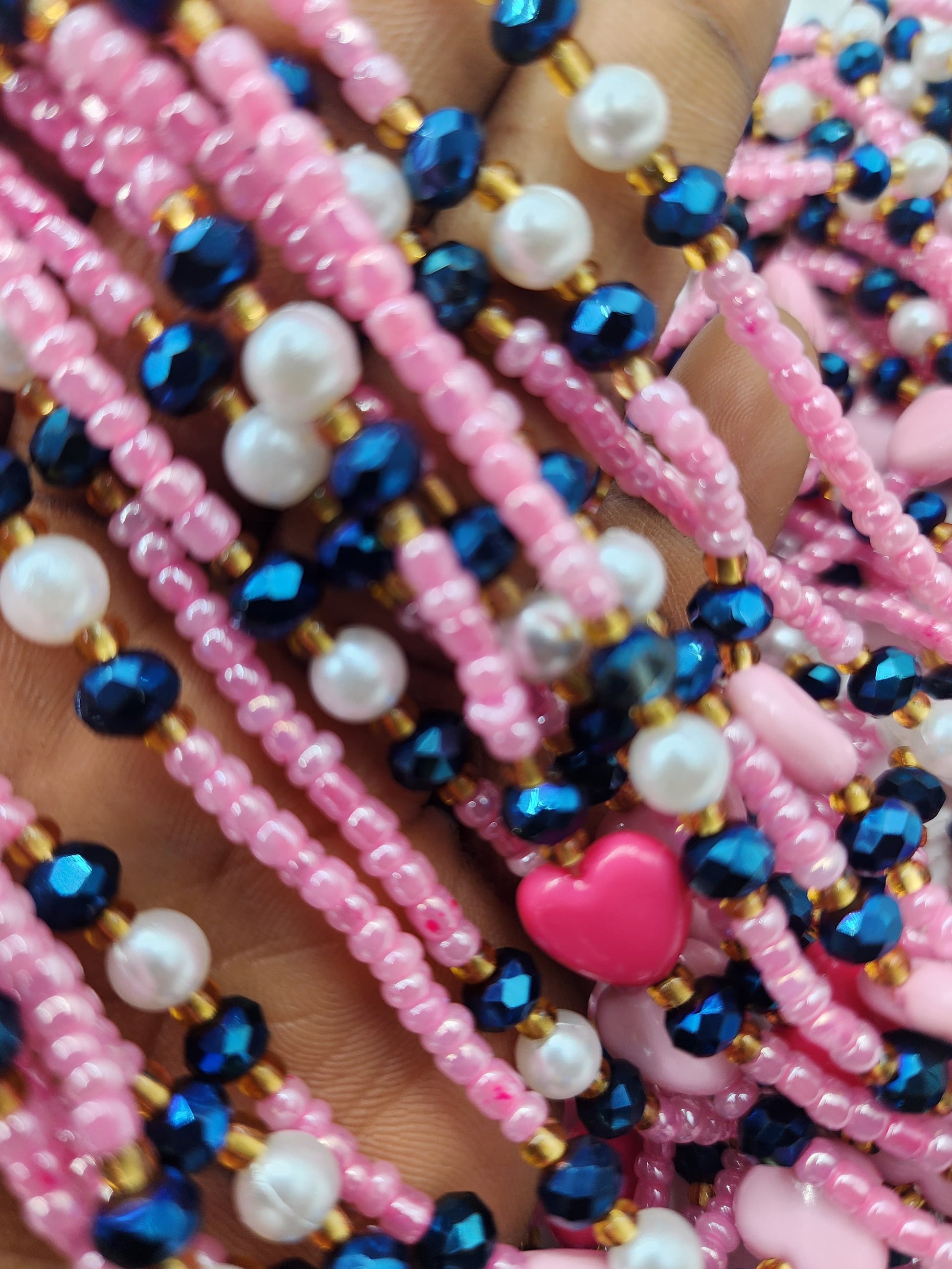 These stunning handcrafted waist beads, featuring an elegant blend of pink seed beads, pearl accents, and bold blue faceted crystals. The adorable heart-shaped pink charms add a playful touch, while the gold bead spacers provide a luxurious finish. Perfect for everyday wear, body adornment, or special occasions, these waist beads symbolize femininity, confidence, and cultural pride.