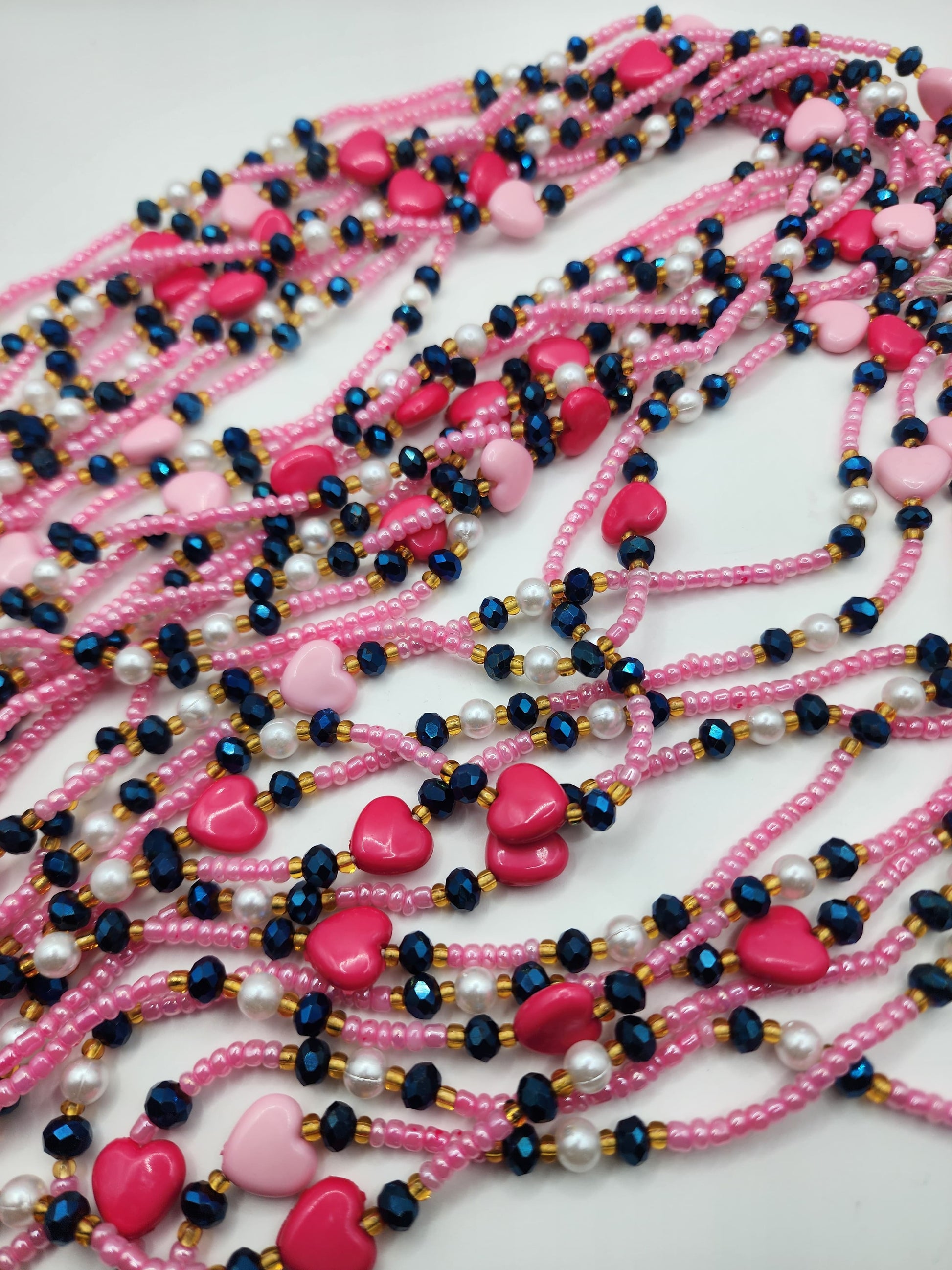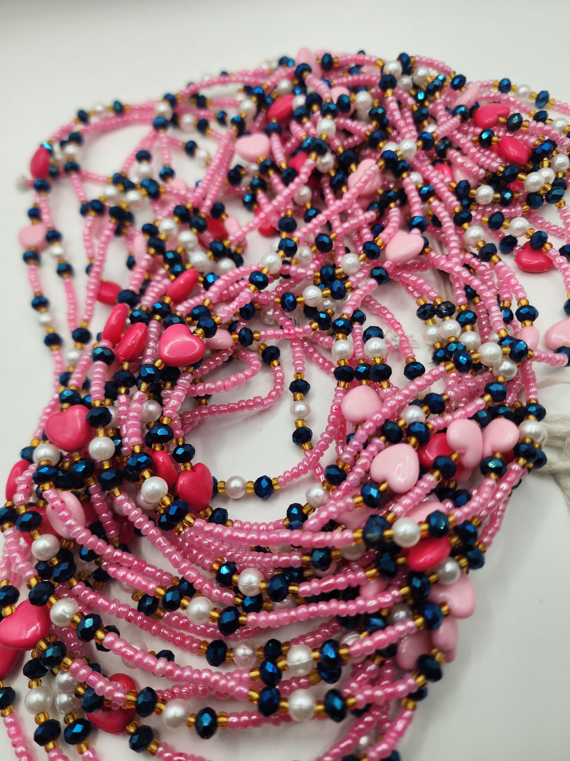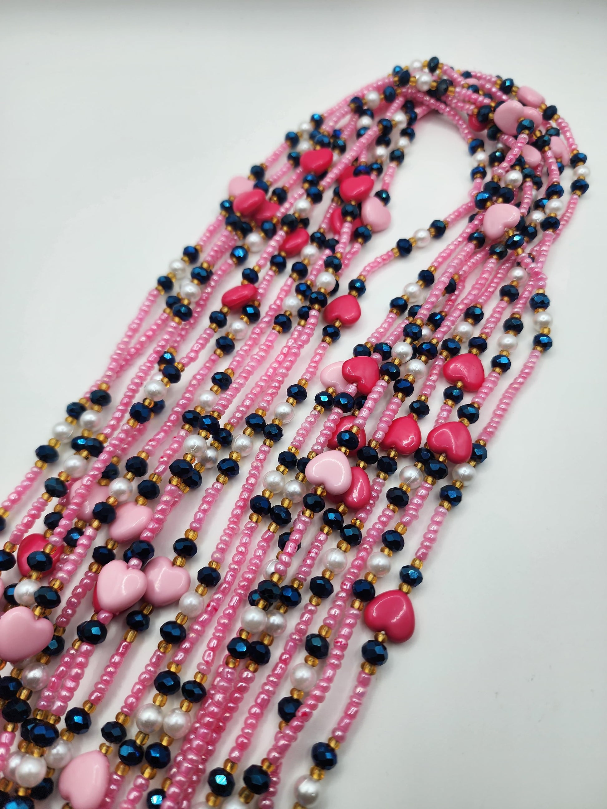 These stunning handcrafted waist beads, featuring an elegant blend of pink seed beads, pearl accents, and bold blue faceted crystals. The adorable heart-shaped pink charms add a playful touch, while the gold bead spacers provide a luxurious finish. Perfect for everyday wear, body adornment, or special occasions, these waist beads symbolize femininity, confidence, and cultural pride.