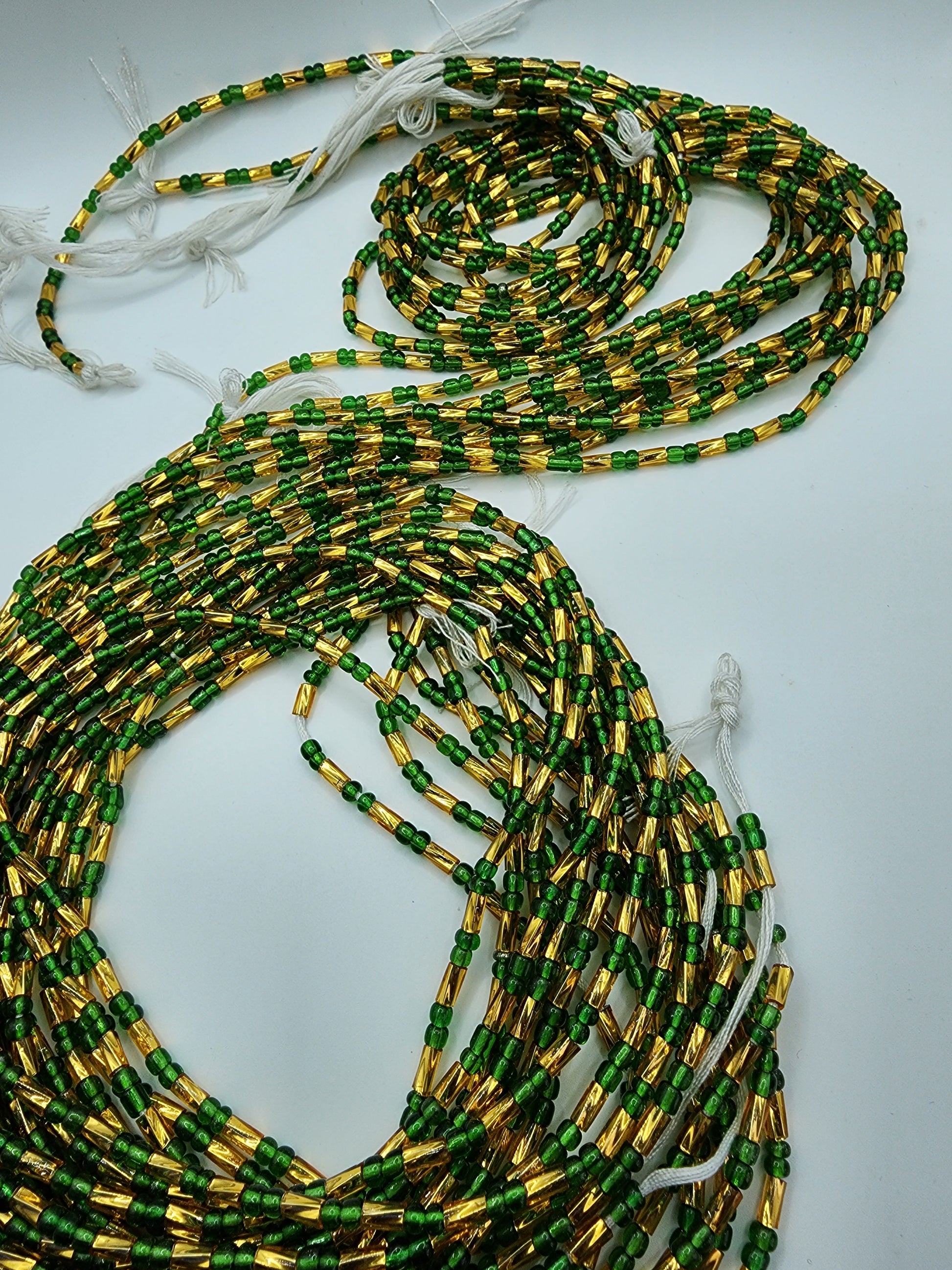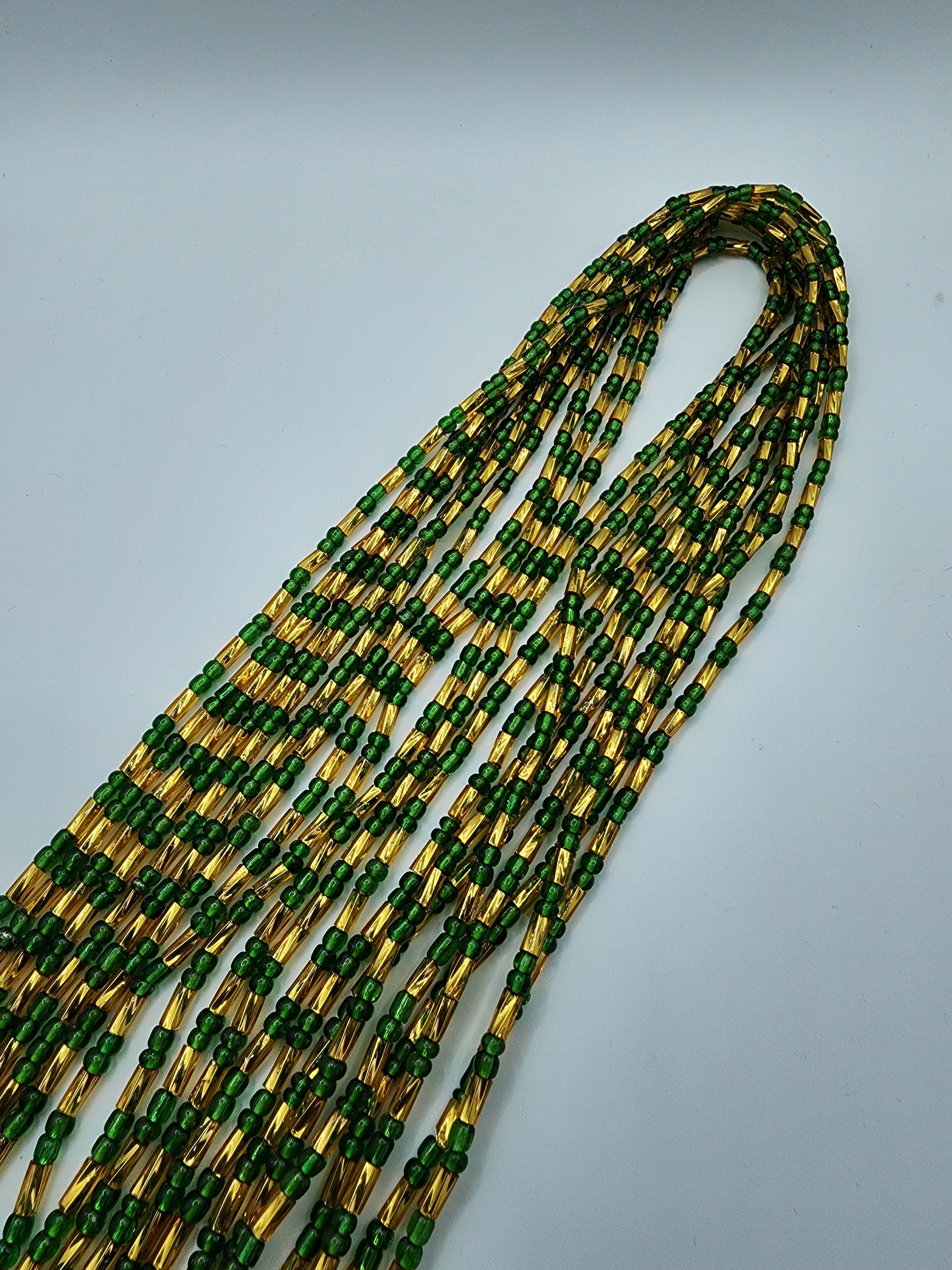 Adorn yourself with the elegance and cultural richness of our handmade Green and Gold Waist Beads. These exquisite beads are crafted with precision using high-quality glass beads, strung on a sturdy cotton string. The combination of green and gold beads symbolizes growth, prosperity, and wealth, making these waist beads not just a beautiful accessory but also a meaningful one.