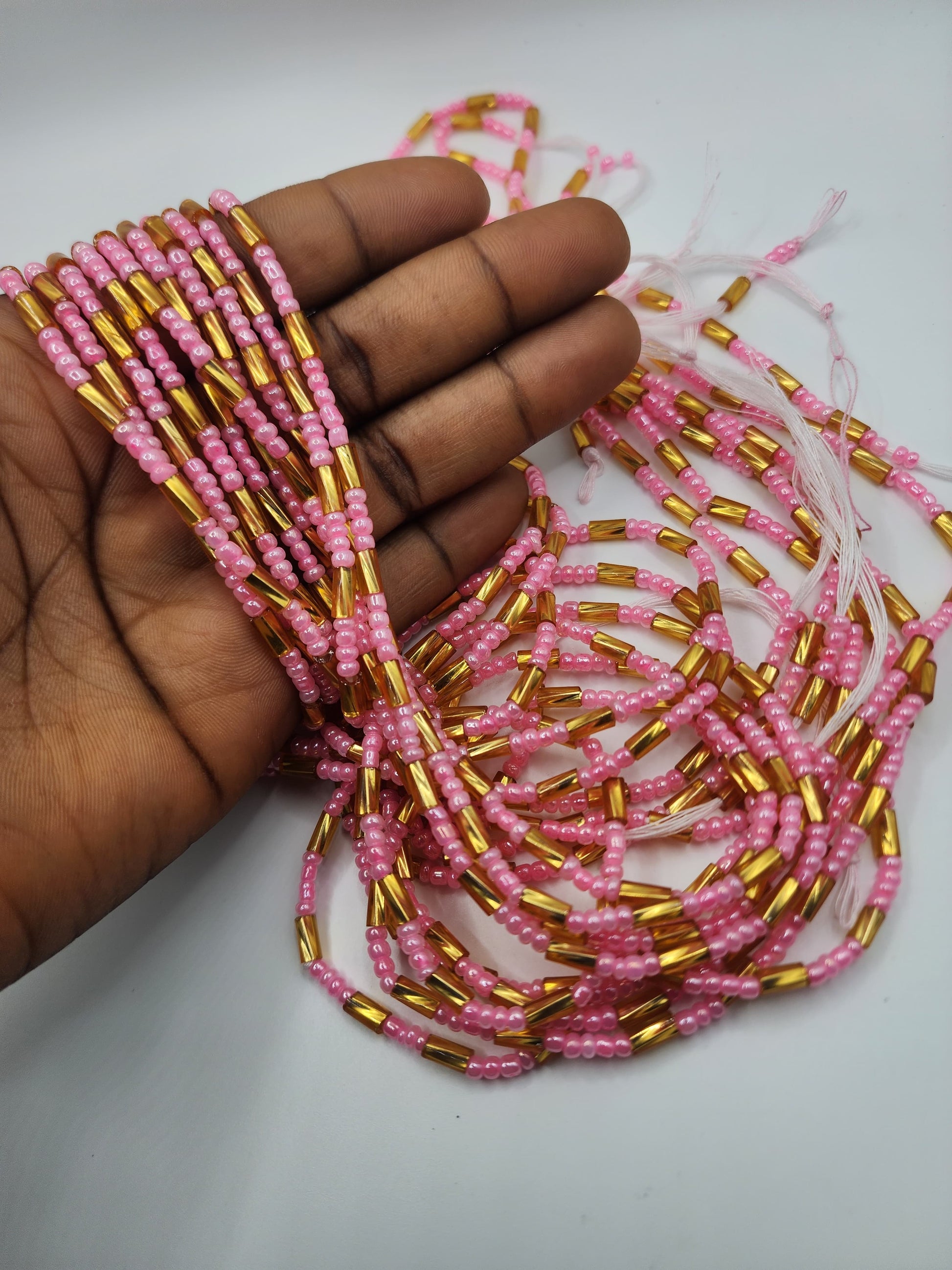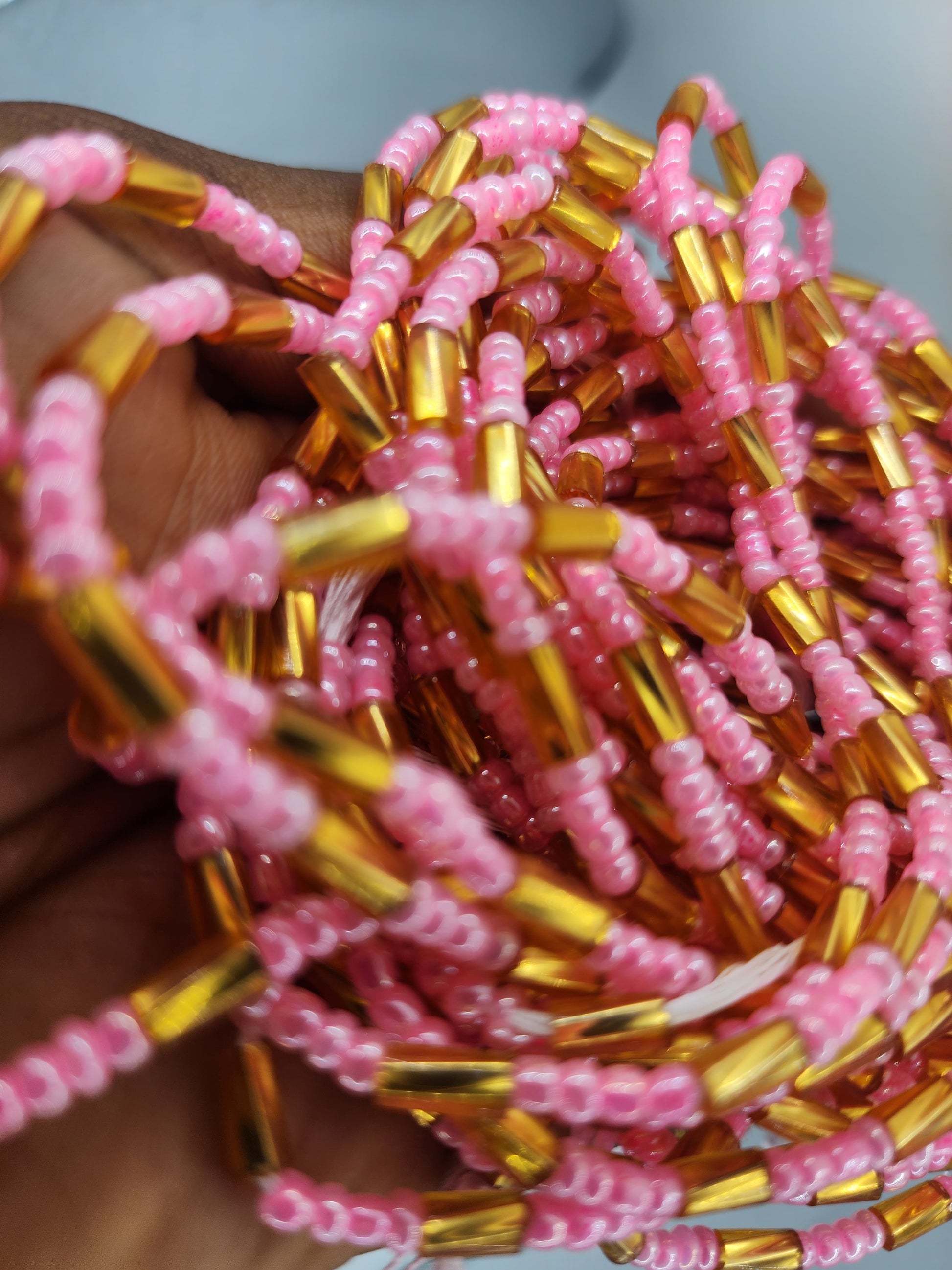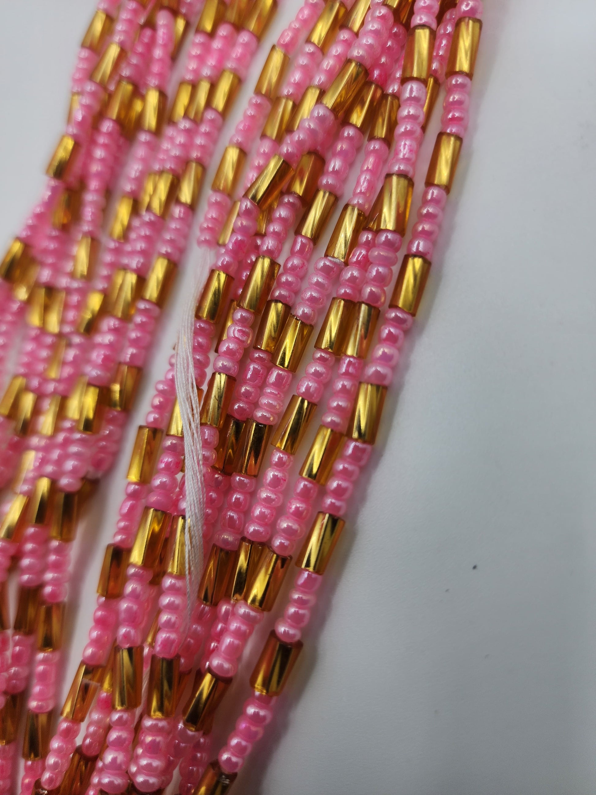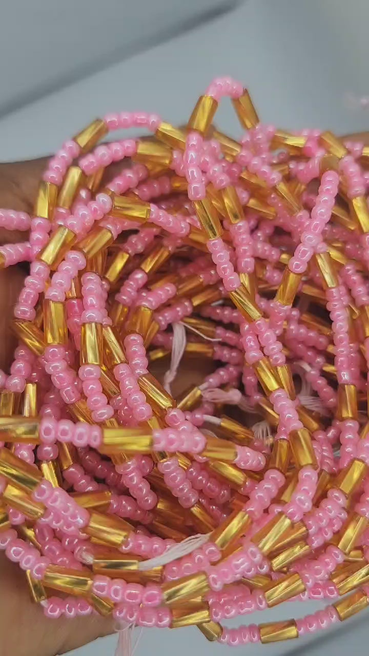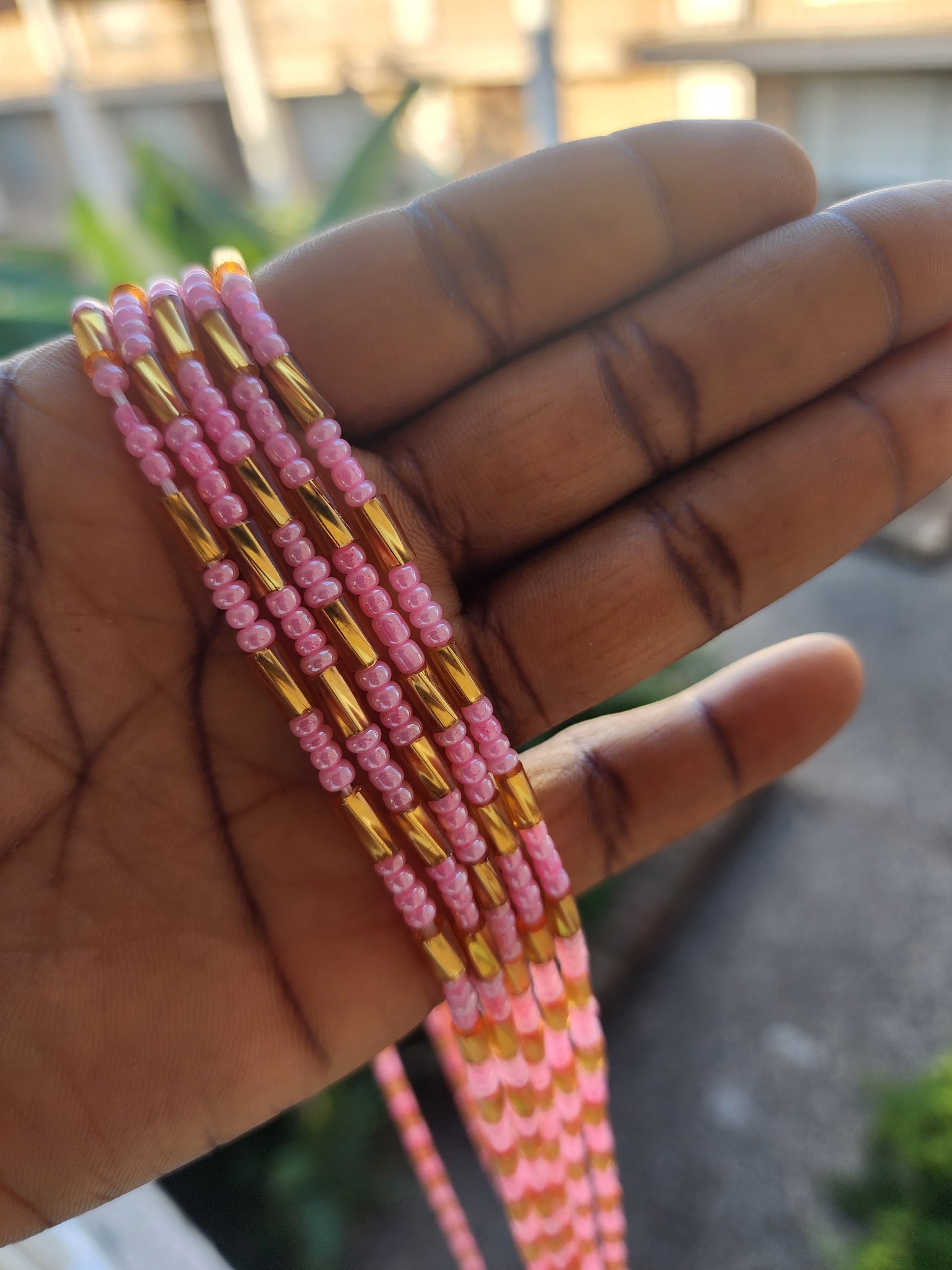 handcrafted pink and gold waist beads, designed to highlight your femininity and enhance your style. Perfect for body adornment, weight management, or a touch of sensual charm, these beads feature a stunning blend of shimmering gold tube accents and delicate pink glass beads. Adjustable and versatile, they celebrate your uniqueness while connecting you to African heritage. Whether for everyday wear or a special occasion, these waist beads are the perfect accessory to elevate your confidence and beauty.
