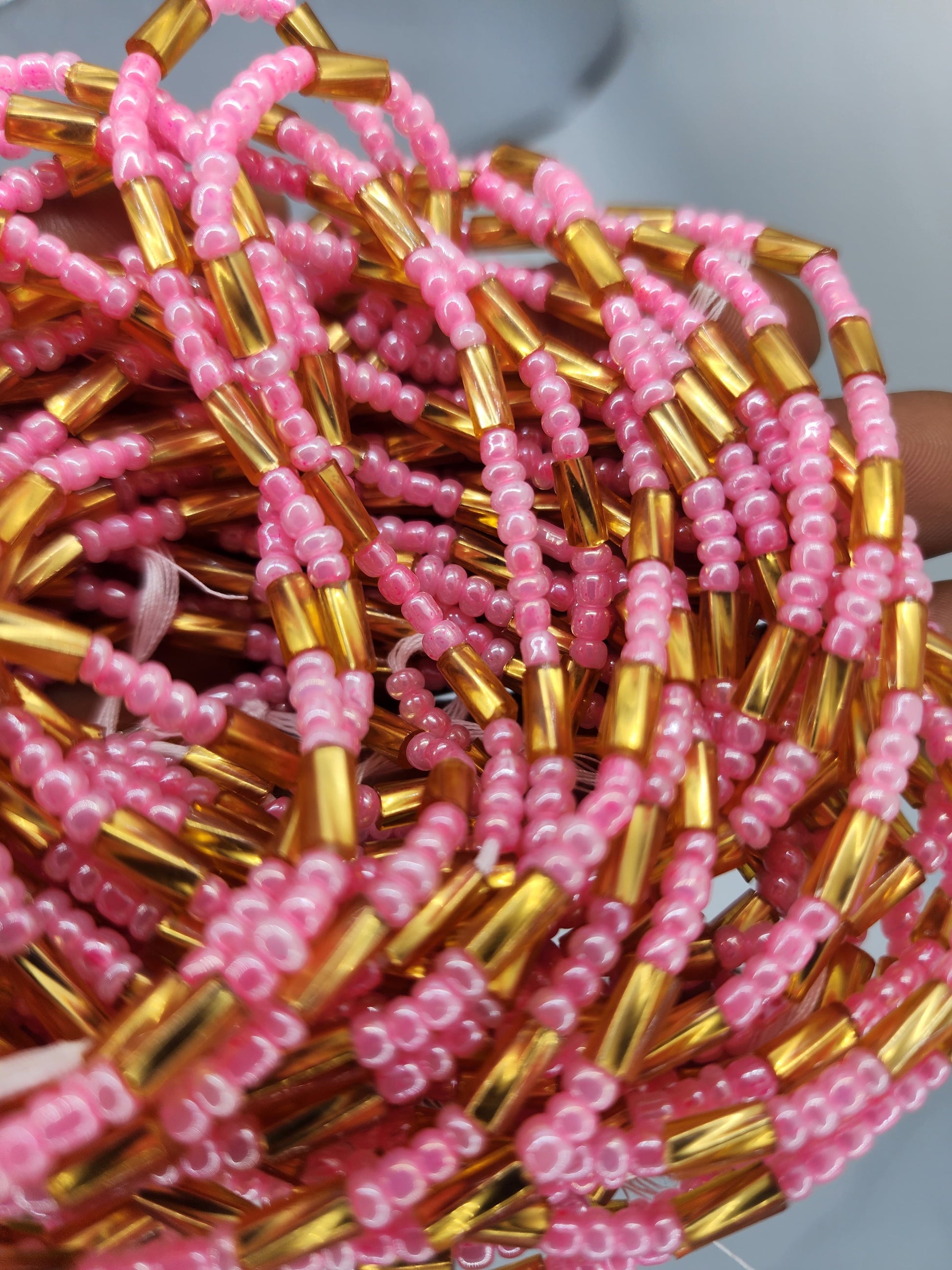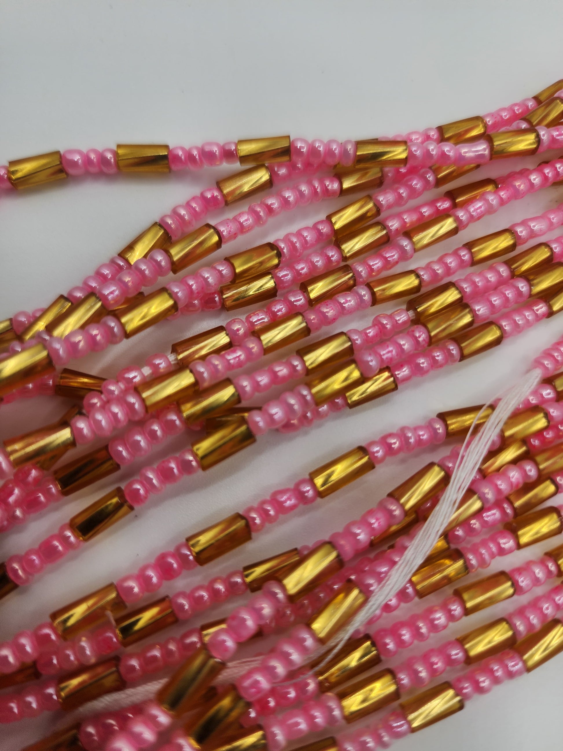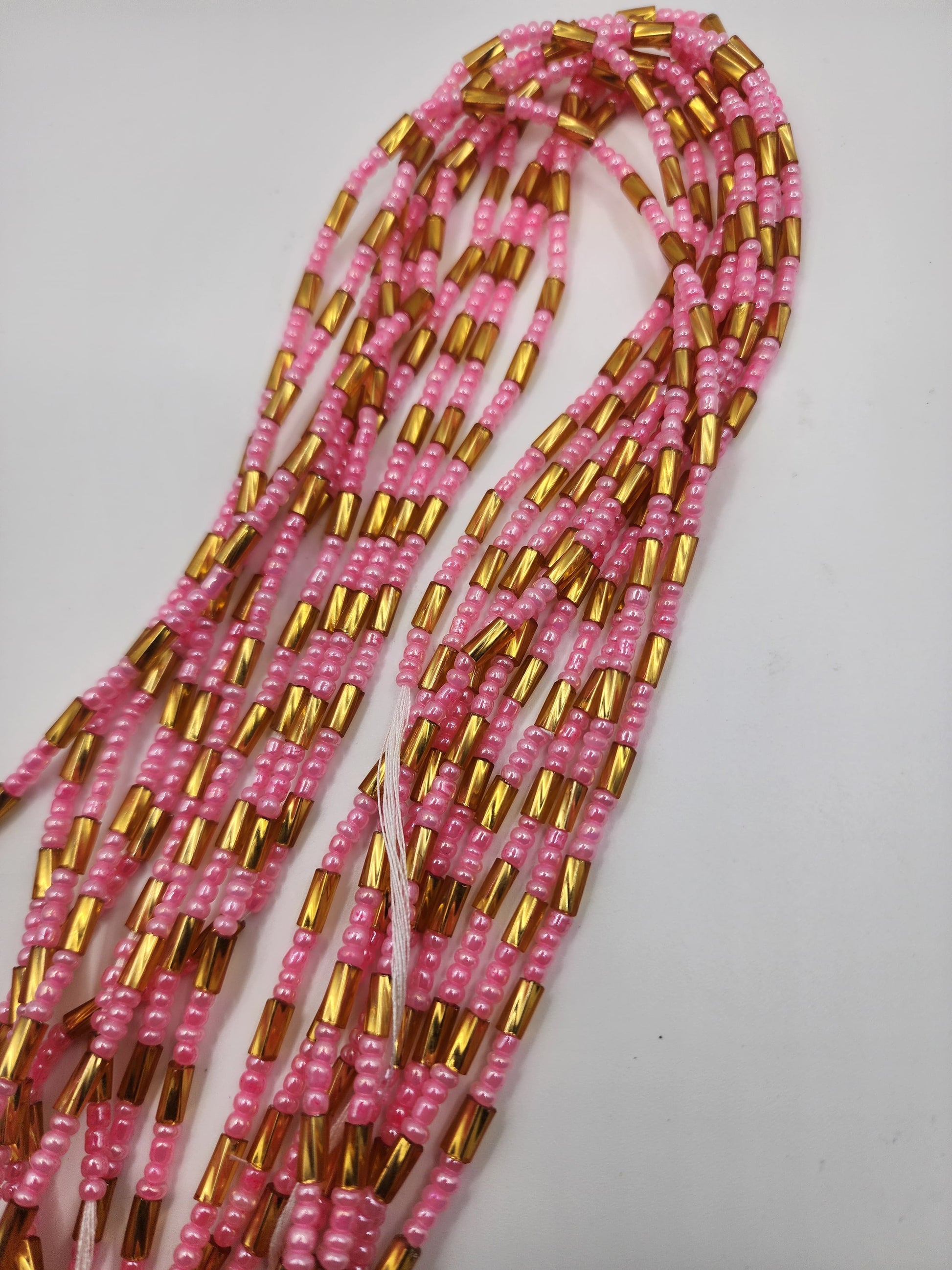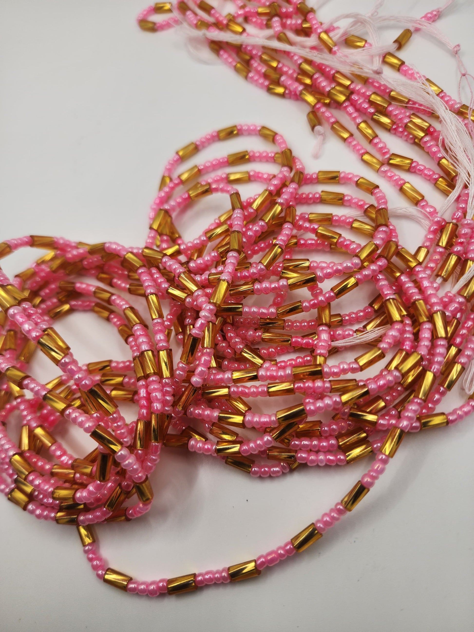 handcrafted pink and gold waist beads, designed to highlight your femininity and enhance your style. Perfect for body adornment, weight management, or a touch of sensual charm, these beads feature a stunning blend of shimmering gold tube accents and delicate pink glass beads. Adjustable and versatile, they celebrate your uniqueness while connecting you to African heritage. Whether for everyday wear or a special occasion, these waist beads are the perfect accessory to elevate your confidence and beauty.