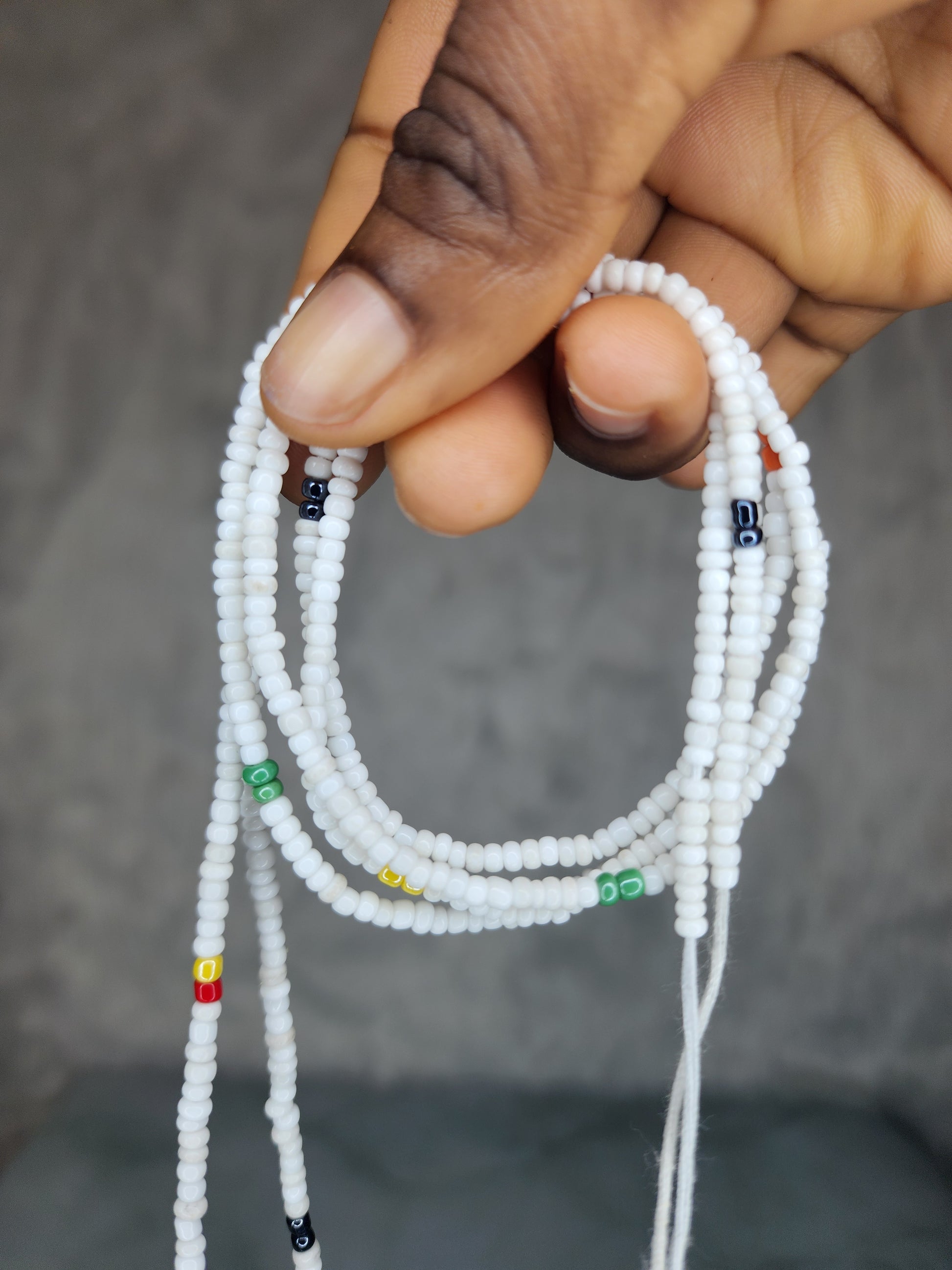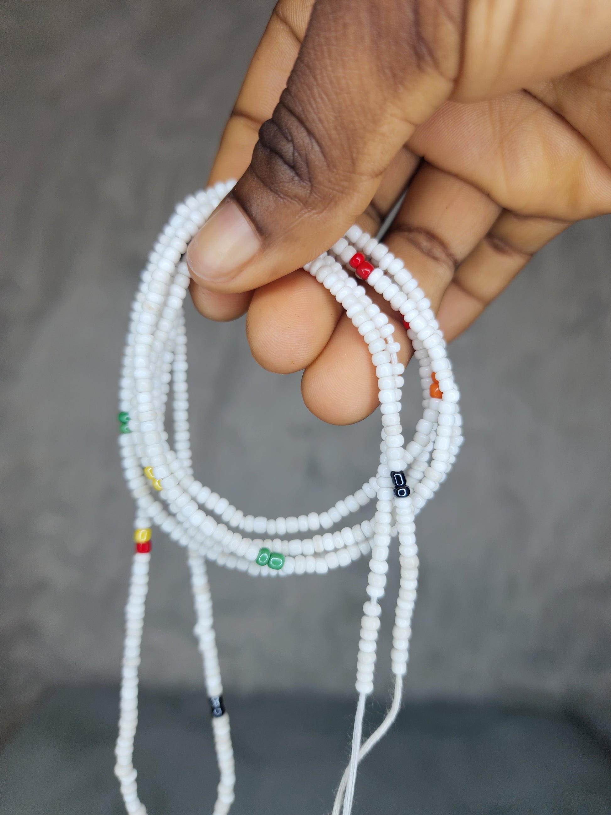 This waist beads embraces calm, confidence, and renewal with purity, a handcrafted chalk white waist bead accented with subtle single-colored beads spaced around for a clean, elegant finish. The soft white symbolizes peace, clarity, and inner strength, while the delicate color accents add just the right touch of vibrance.