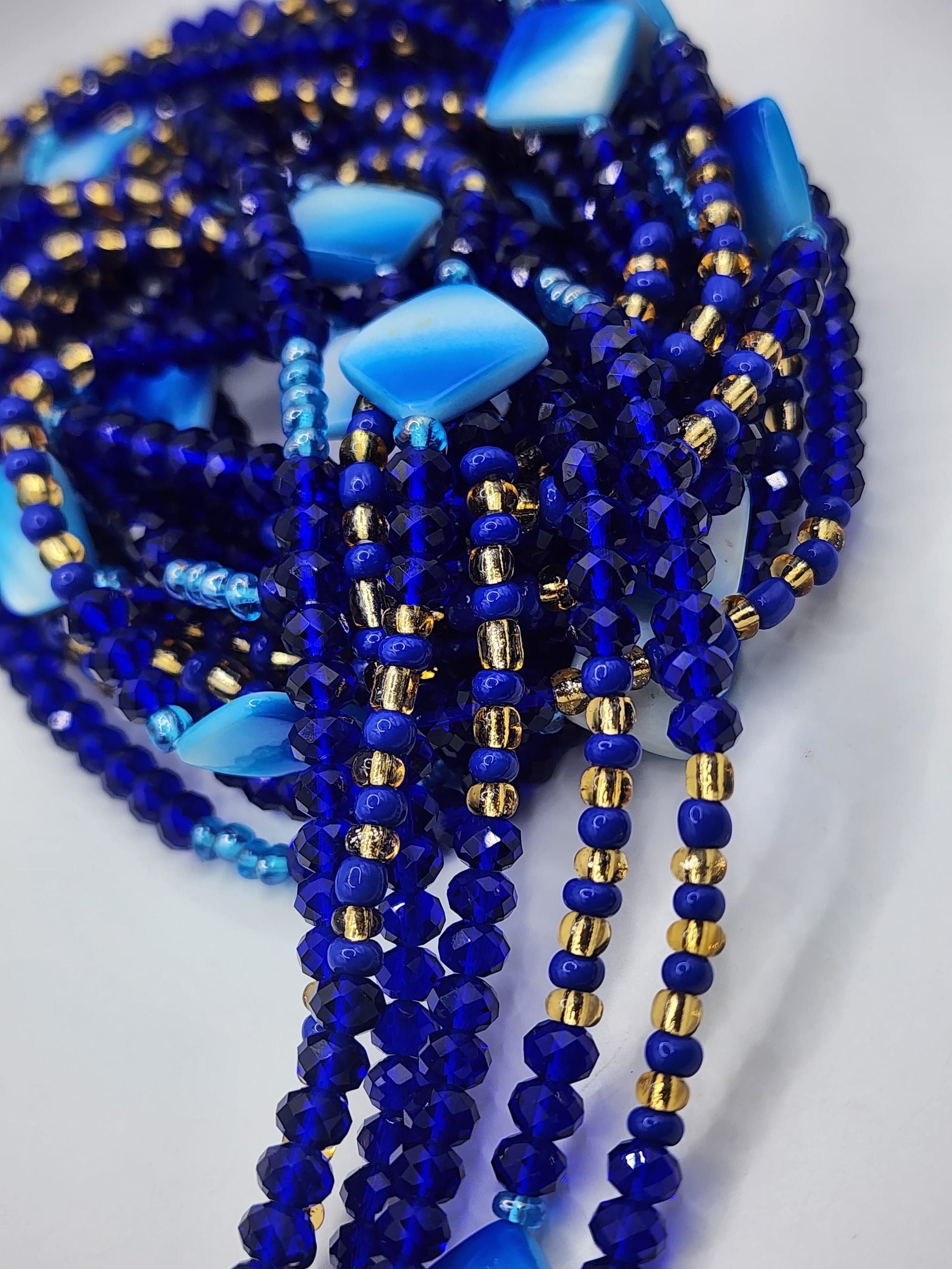 Celebrate your beauty, culture, and confidence with these stunning handmade African waist beads. Featuring rich royal blue crystal beads, shimmering gold accents, and unique blue gemstone-style charms, this piece- Salewa’ blends elegance with heritage. Perfect for body adornment, self-expression, or as a meaningful gift.