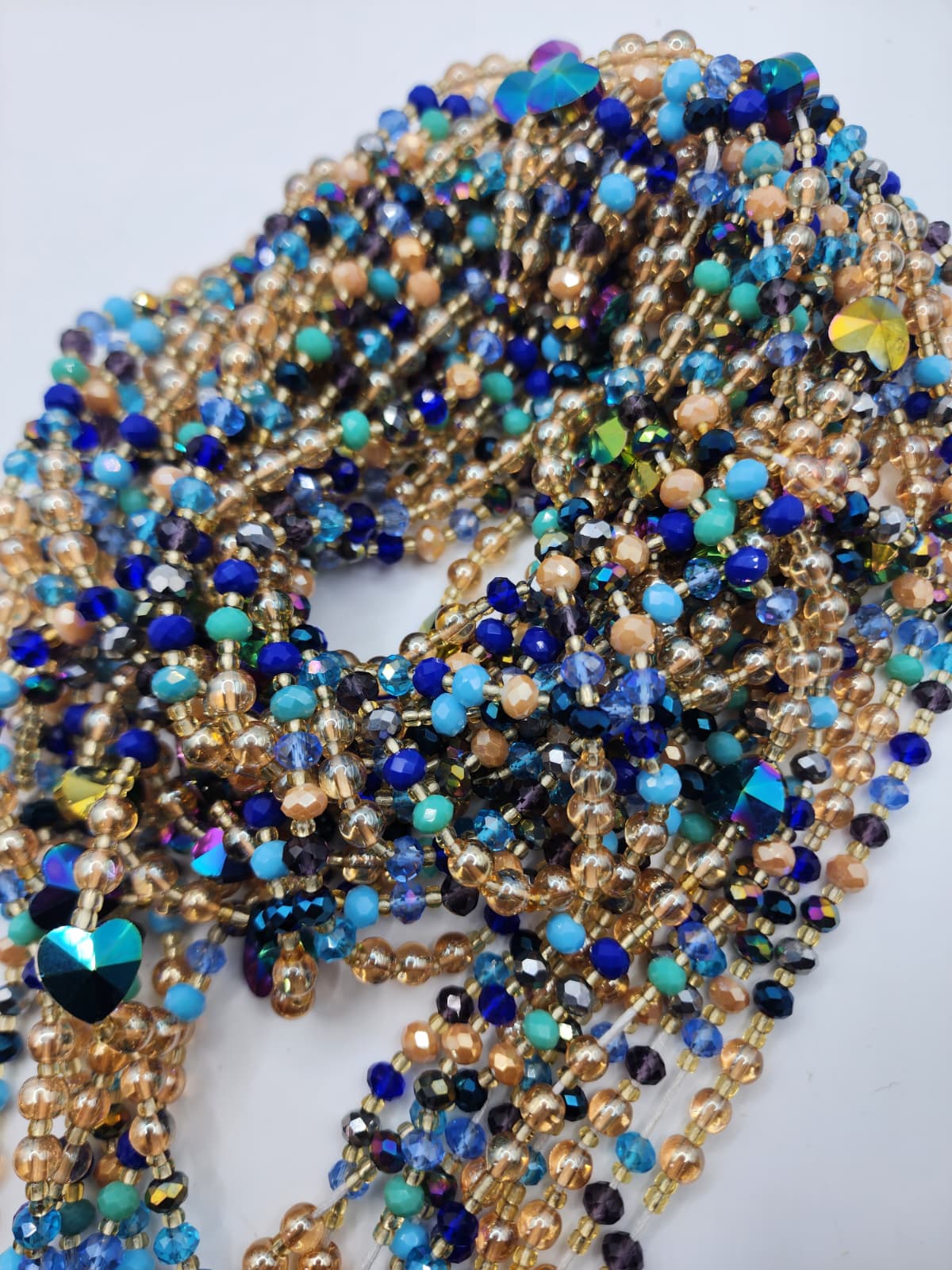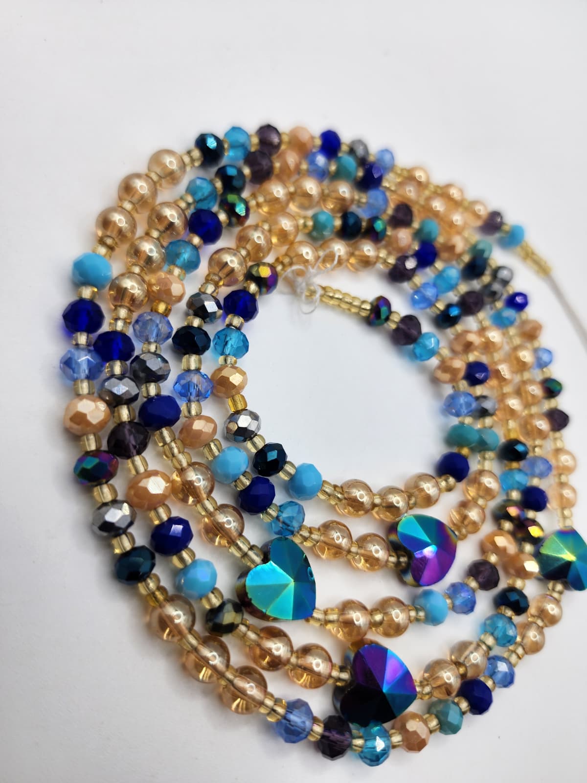 Handmade African waist beads crafted with a vibrant mix of gold, turquoise, deep blue, and crystal beads for a bold and elegant look. These strands are adjustable up to 50 inches, making them versatile for all body types. The shimmering glass beads reflect light beautifully, giving your waist a radiant touch whether worn under clothing or styled openly.