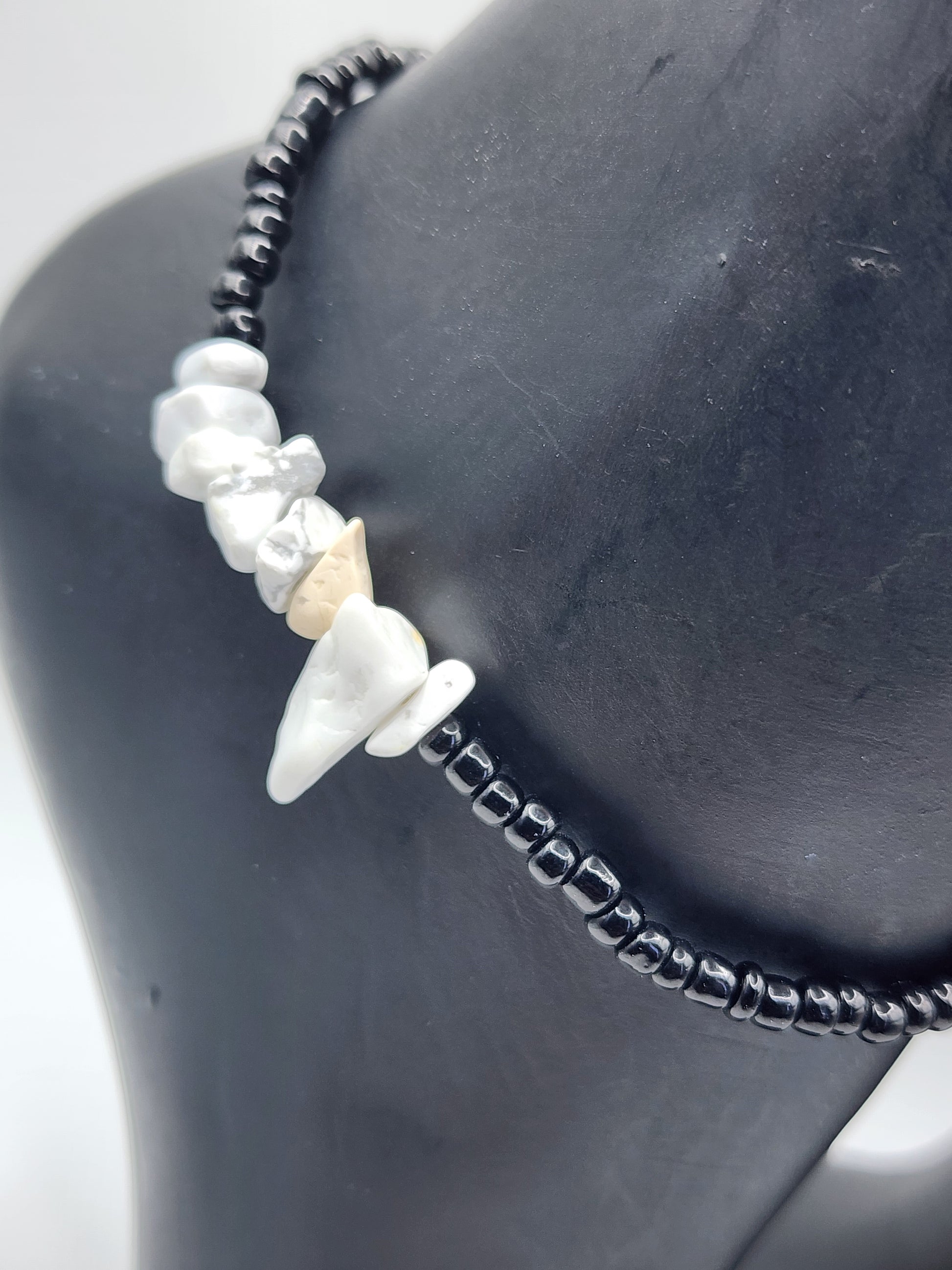This exquisite piece features sleek black beads paired with natural Howlite stones, known for their calming and balancing properties. The black beads add a touch of sophistication, while the white stones bring a sense of tranquility and purity.