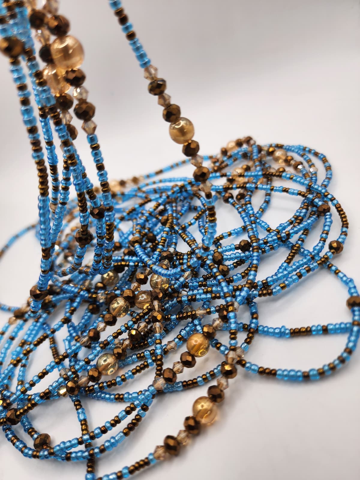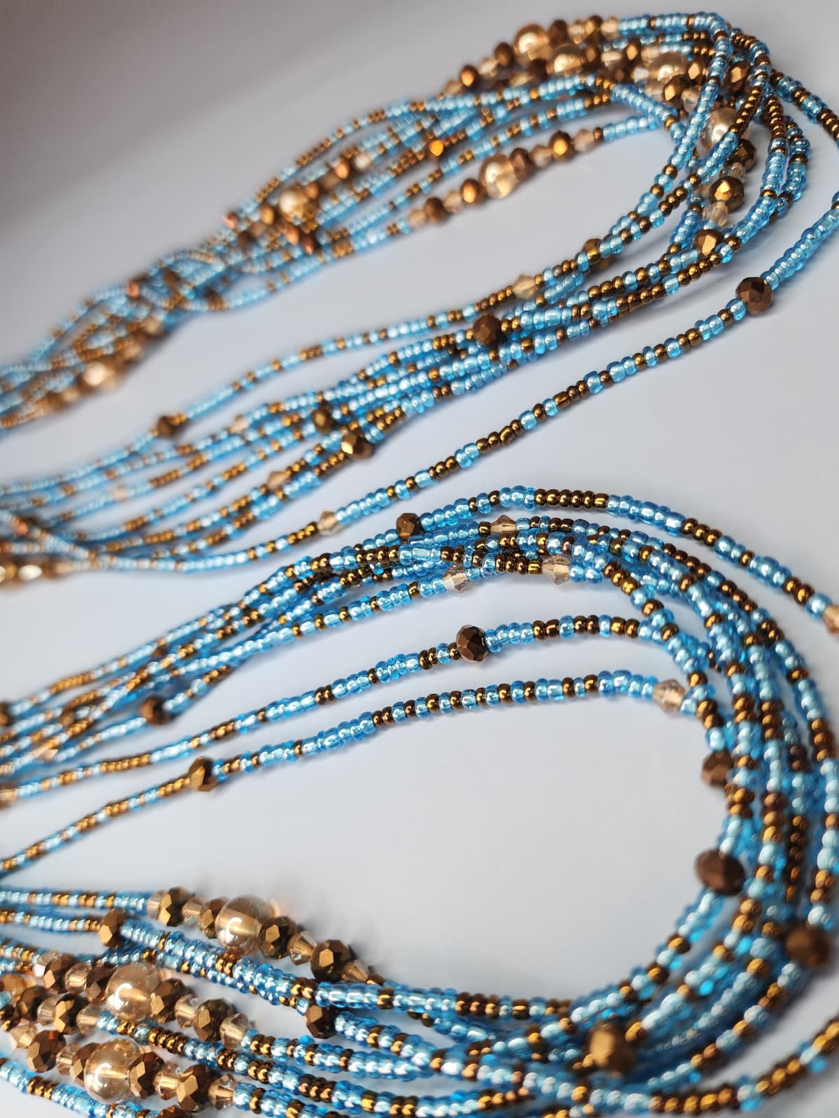 Handmade African waist beads featuring a bold combination of shimmering blue and metallic gold beads. Adjustable up to 50 inches, this strand is designed for those who want to shine with confidence, cultural appreciation, and individuality. The vibrant colors reflect beautifully in light, making them versatile for daily wear or special occasions.